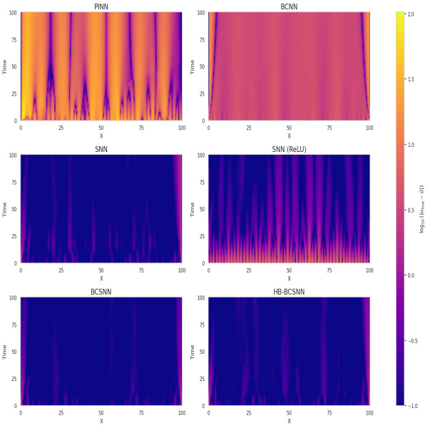 Pointwise absolute error plots for the heat equation tested across five architectures. The plots show the mean absolute error achieved by each architecture on a periodic-mode initial condition. Errors are shown on a logarithmic scale. Blue colors indicate smaller errors. (Image by E. A. Duta Costache.)