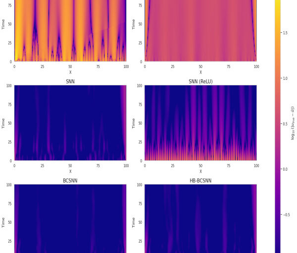 Pointwise absolute error plots for the heat equation tested across five architectures. The plots show the mean absolute error achieved by each architecture on a periodic-mode initial condition. Errors are shown on a logarithmic scale. Blue colors indicate smaller errors. (Image by E. A. Duta Costache.)